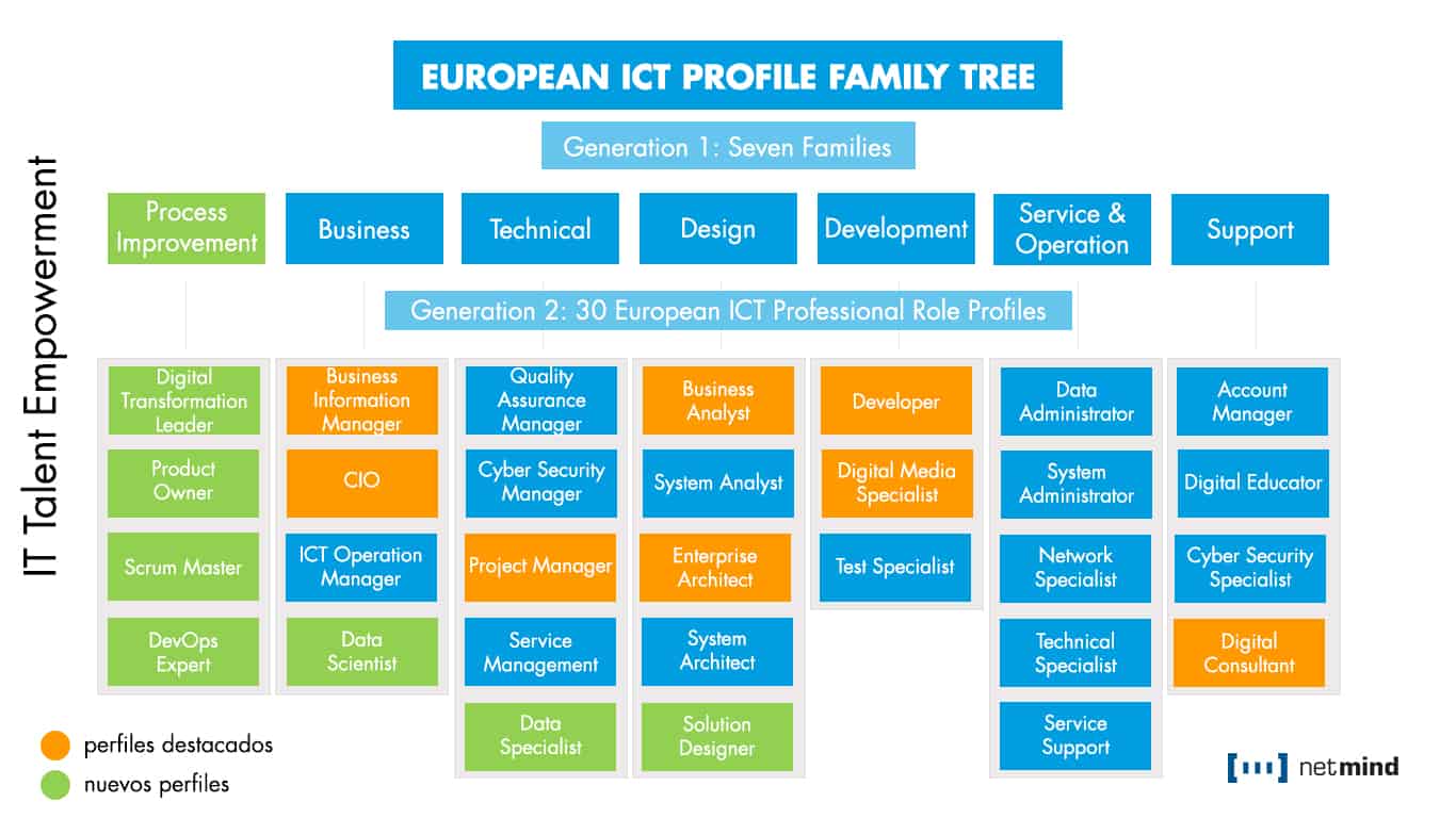 En Netmind utilizamos el e-Competence Framework y el European ICT Professional Profiles  como marcos de referencia para la definición de las competencias de los perfiles IT y que nos puede ayudar a este procesos de definición o transformación de nuestros profesionales IT