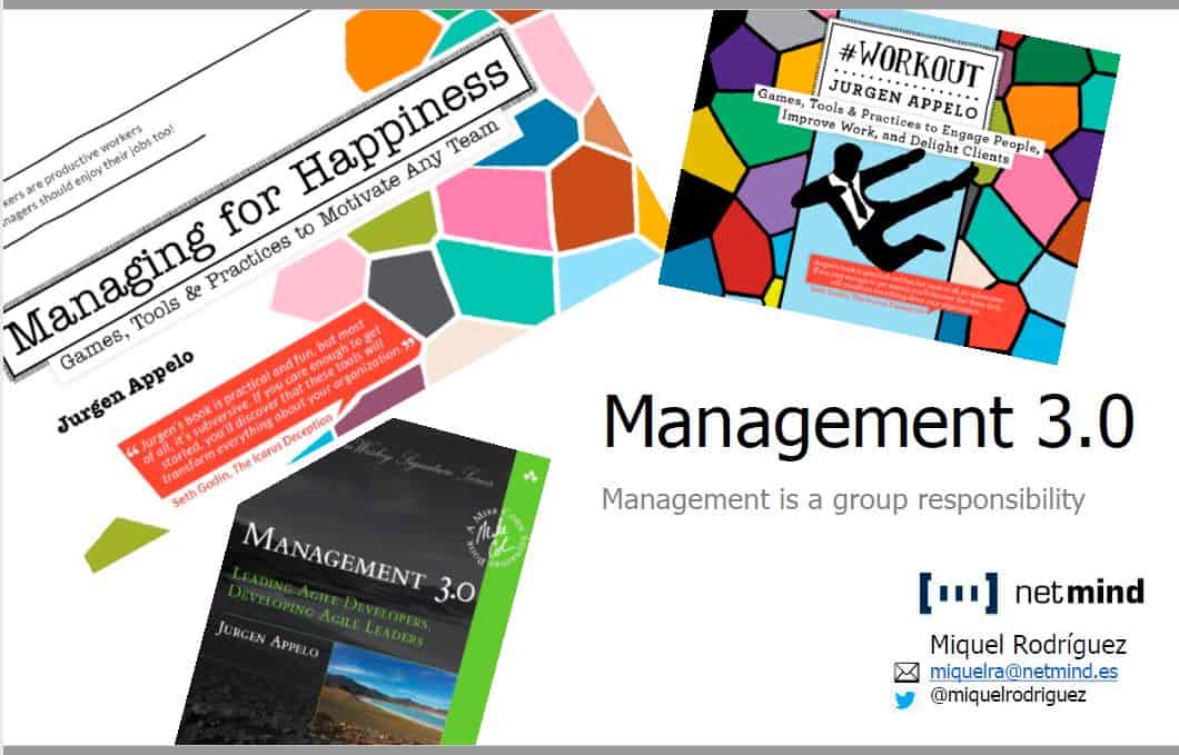 Management 3.0 es una innovadora forma de afrontar el liderazgo y la gestión de equipos y organizaciones creada por Jurgen Appelo y plasmada en los libros Management 3.0 y Managing for Hapiness.