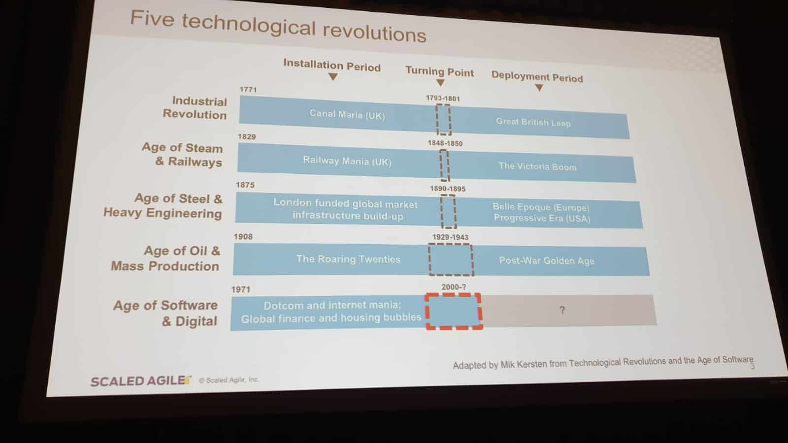 Dean se centró en las razones por las que utilizar un marco de trabajo y en la importancia del momento que estamos viviendo. Citando a Mik Kersten, autor del libro Project to Product, aquellos que consigan dominar la entrega de software a gran escala definirán el escenario económico del siglo XXI. Estamos en la transición de la 5ª revolución tecnológica, y las empresas que siguen diferenciando IT de Negocio no están aún preparadas para la era digital.