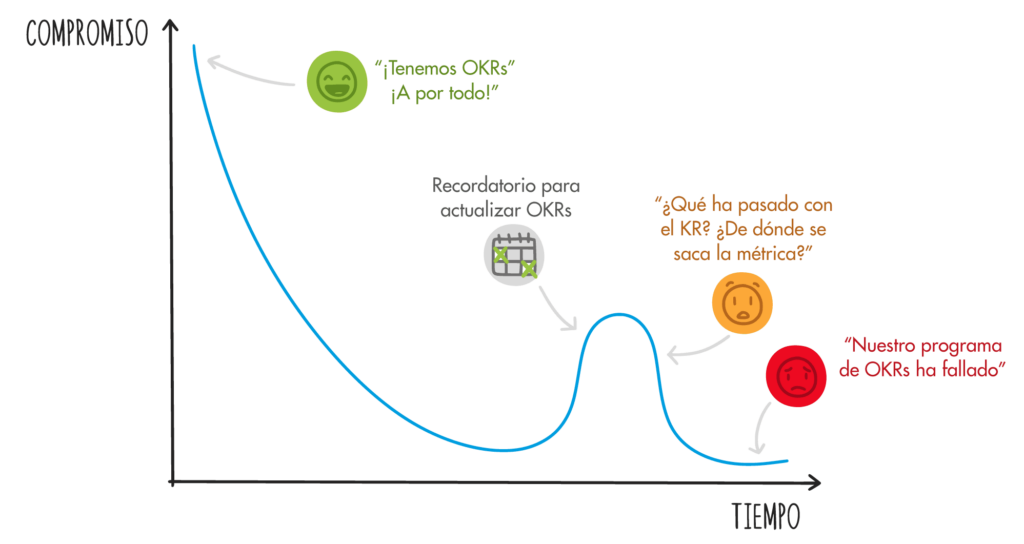 La trampa del definir y olvidar (Set it and forget it) suele ser uno de los problemas más frecuentes a los que se enfrenta el éxito de la implementación de un programa de OKRs dentro de una organización. Los OKR no deberían olvidarse una vez establecidos y para esto, los Check-Ins periódicos son cruciales para monitorear el progreso, discutir los obstáculos y la confianza que tenemos para alcanzar los objetivos propuestos. Esto mantiene al equipo alineado y adaptable a los cambios, también contribuye con el aprendizaje, ya que entenderemos cuál es el comportamiento de nuestros OKRs, pudiendo predecirlo y consecuentemente podremos ajustar las estrategias según sea necesario.