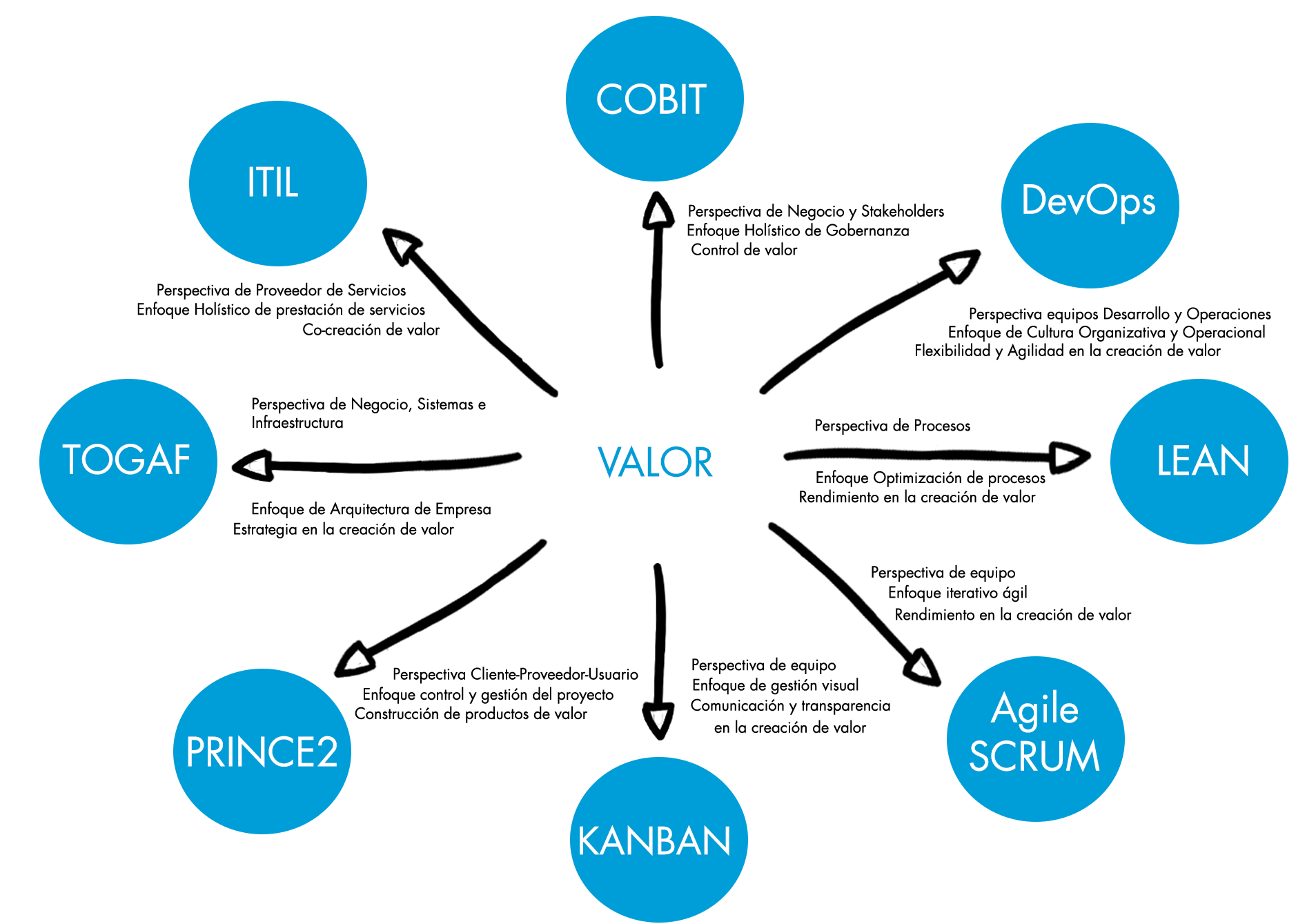 ITIL® es un marco que abarca toda la problemática de un proveedor de servicios TI de extremo a extremo, desde que aparece una Oportunidad o Demanda hasta que el proveedor entrega una solución que resulta en valor para el cliente. Incluye las dimensiones de Organizaciones y Personas, de Información y Tecnología, de Socios y Suministradores, y de Flujos de Valor y Procesos. Se apoya en el resto de frameworks para aspectos específicos técnicos o de gestión. Plantea que la creación de valor ha de ser un ejercicio de colaboración entre suministradores, el proveedor y el cliente (co-creación del valor).