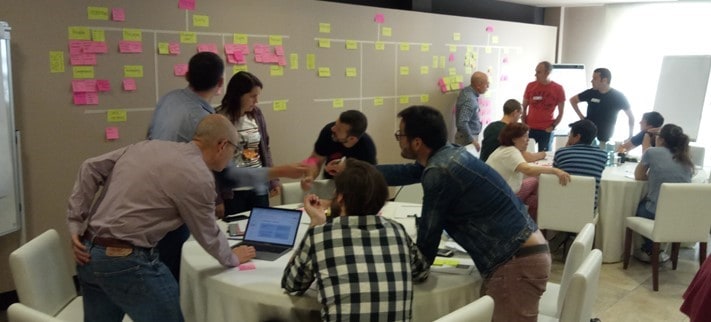 En el ejemplo de esta semana, la introducción al evento la realizó la persona responsable de la transformación, explicando la situación de la organización y los principales hitos que tenían por delante, los objetivos del workshop e invitando a todo el mundo a participar. En la sala se mantuvieron colgados durante todo el workshop los objetivos, la agenda y los entregables esperados de la sesión.
