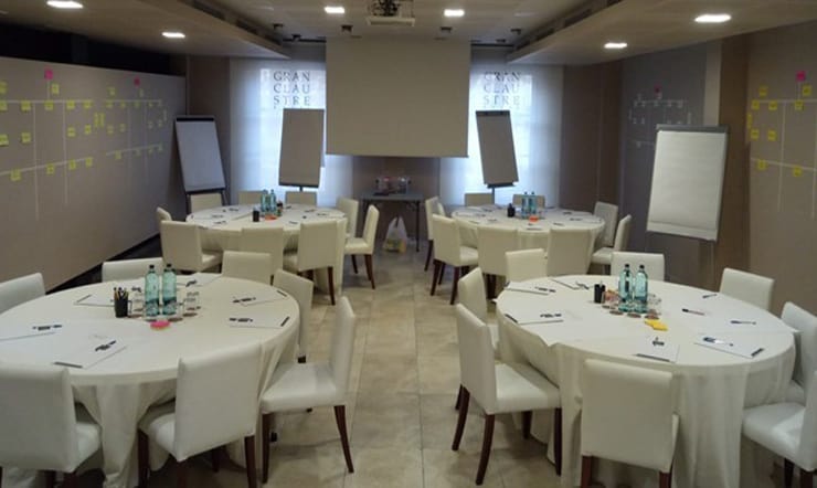 En el workshop de esta semana, organizamos la sala en un conjunto de mesas redondas y alrededor de ellas, flipcharts, rotuladores, postits… y café, claro.