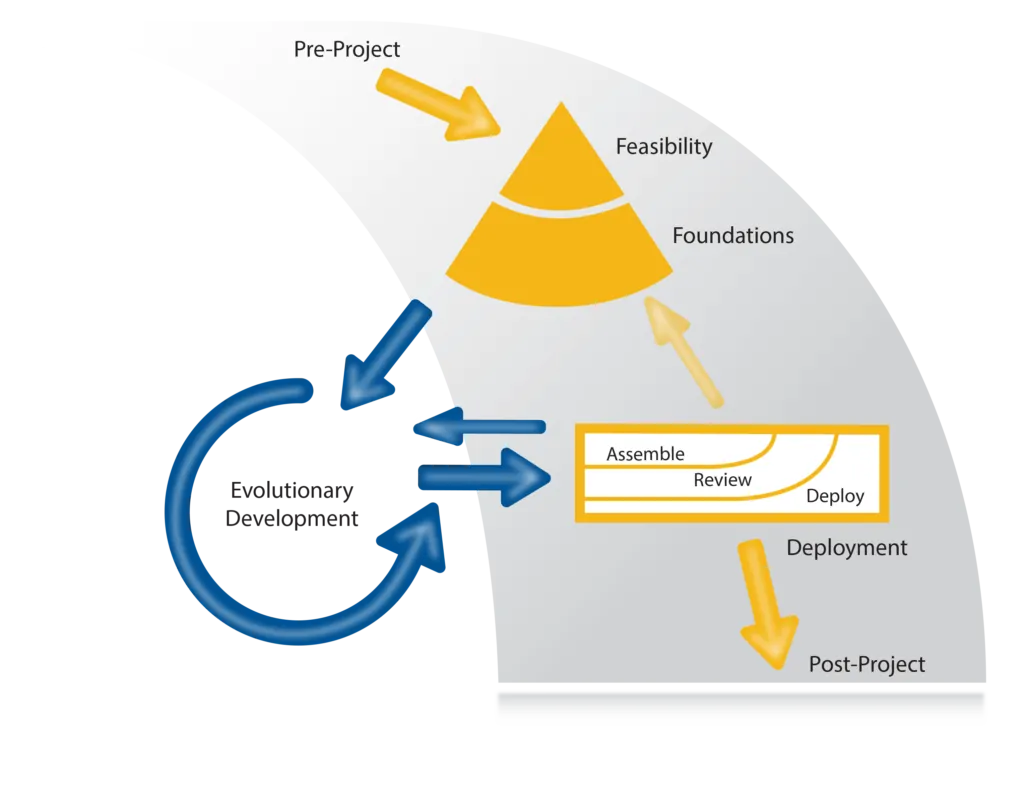 Establecer las bases del proyecto, sin entrar en detalle, para entender la solución potencial a crear, y como llevaremos a cabo el desarrollo y la gestión del proyecto. Debería llevarnos días, pocas semanas a lo sumo, incluso para proyectos grandes y complejos. El objetivo es entender el alcance del trabajo a alto nivel y cómo lo ejecutaremos, quién, cuándo, dónde, y cuánto nos va a costar. Para proyectos pequeños podemos fusionar Feasability y Foundations en una única fase de pocos días.