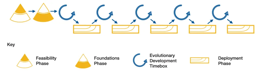 A partir de los fundamentos establecidos, el objetivo de esta fase es crear y evolucionar la solución. Requisitos breves y orientados a valor, escritos por ejemplo en forma de User Stories, priorización con MoSCoW, utilizar timebox de 4 semanas como máximo (cuanto más cortos mejor)… El formato del timebox es similar a Scrum, estableciendo objetivos y alcance al principio, coordinando el avance mediante daily stand up meetings, demostrando el producto terminado al final de la iteración, y reflexionando con una retrospectiva. El testing está integrado en esta fase, y nos aseguramos que el incremento desarrollado satisface las necesidades de negocio y está construido correctamente.