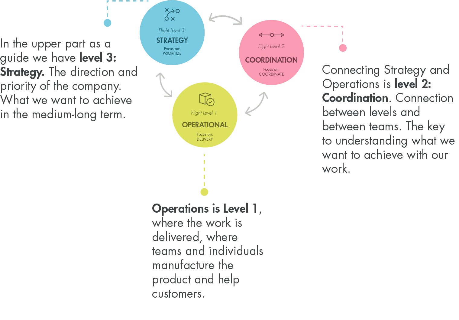 If we extrapolate the different levels within an organization, we can understand them as interrelated objectives. First, at the top we have Flight Level 3: Strategy. The direction and priority of the company or what is the same: what we want to achieve in the medium to long term. Secondly, Flight Level 2: Coordination. The connection between Strategy and Operations. At this level is the key to understanding what we want to achieve through the fruits of our labor. And thirdly, Flight Level 1: Operations, composed of teams and individuals, where the work is delivered, the product is manufactured and customers are supported.