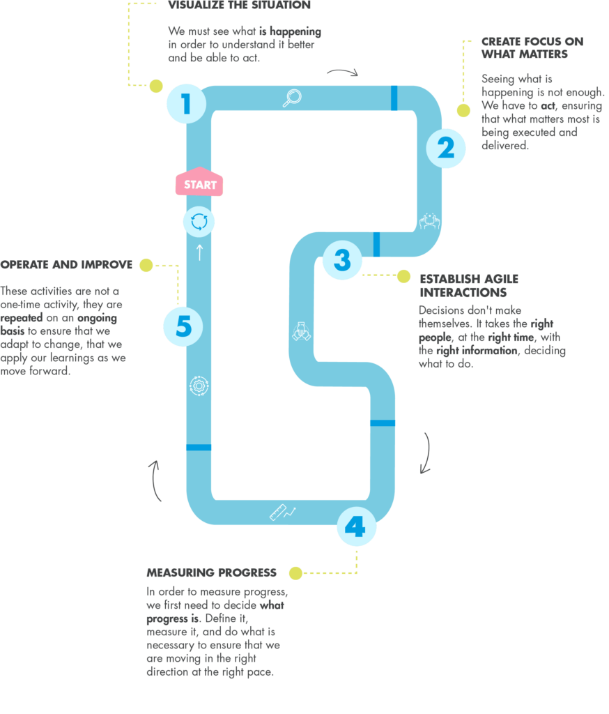 First, visualize the situation. You need to see what is happening, and to do this you need to ask yourself what work is going on, what results are being achieved or where processes are running aground. Secondly, create focus on what is important. That is, seeing what is happening is not enough, so you have to act, ensuring that what is most important is being executed and delivered. Limiting work in progress, prioritizing, stopping or uncaging are ways to create focus on what is important.