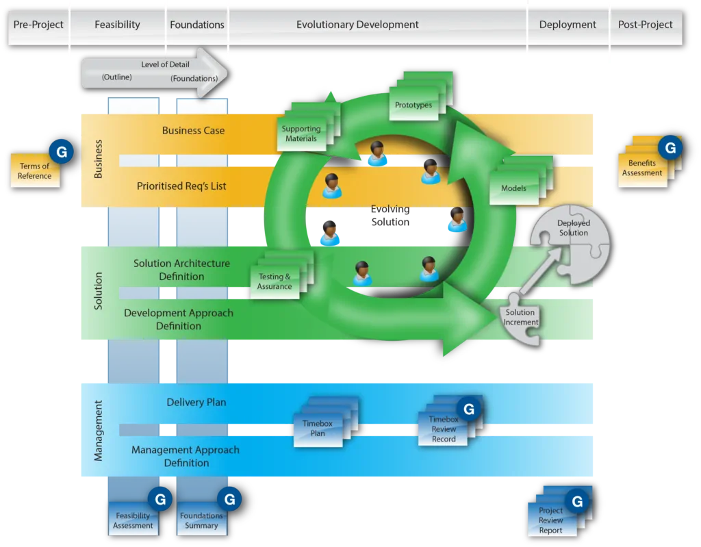 - Development Approach Definition. Nos describe a alto nivel qué herramientas, prácticas, estándares, … serán aplicados durante el desarrollo de la evolución. Siguiendo los principios de DSDM, el desarrollo deberá ser iterativo, con entregas incrementales, e integrando el testing en todo el proceso. Por tanto, incluirá el detalle de cómo tenemos previsto asegurar la calidad de la solución desarrollada.
