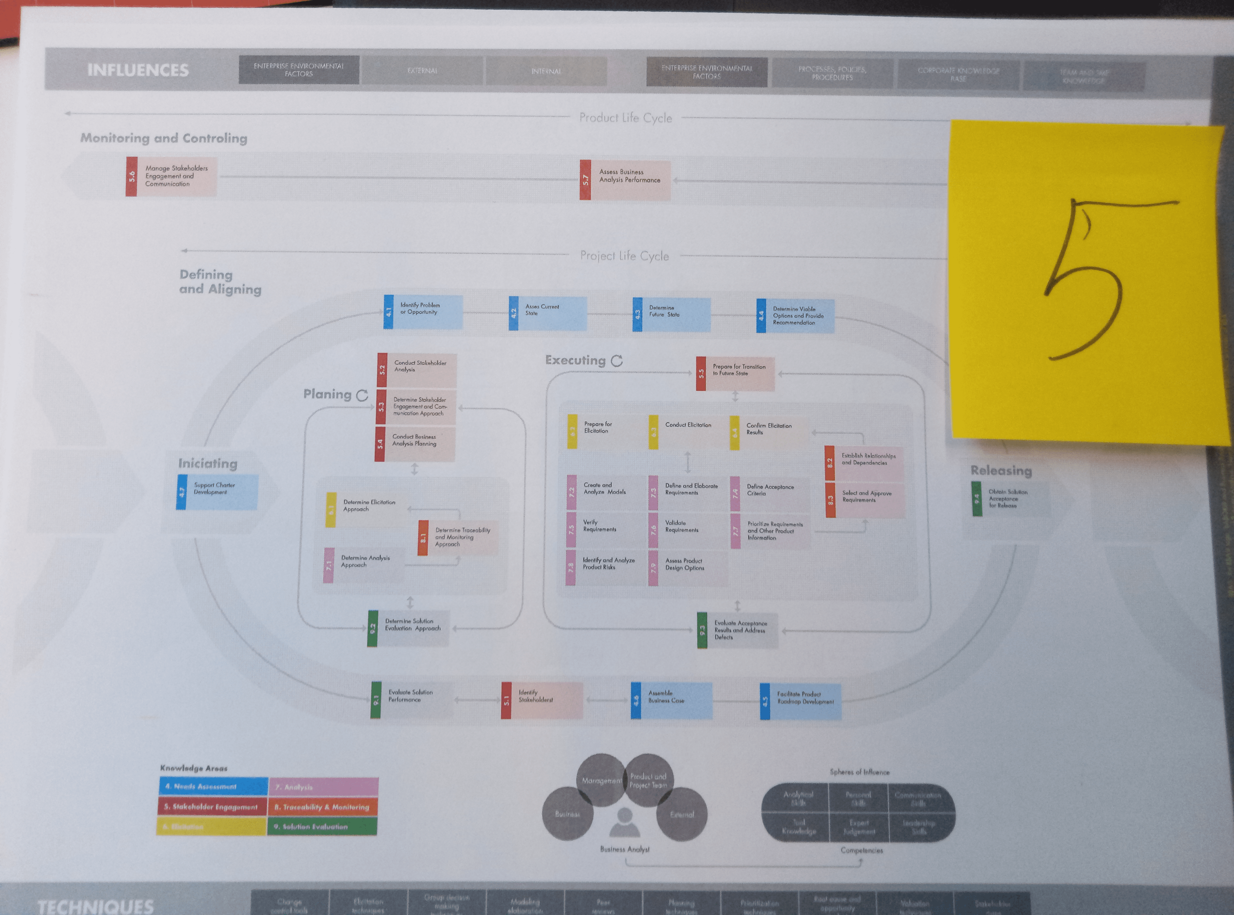 Nos decantamos, en la iteración 3, por una visión del ciclo de vida de producto como hilo conductor para explicar la función de Análisis de Negocio. No entramos en detalle de contenido sino en estructura visual. Este enfoque nos permitía utilizar el espacio alrededor del ciclo para incorporar información adicional, más allá de procesos (influencias externas e internas, áreas de conocimiento y el rol del analista de negocio).