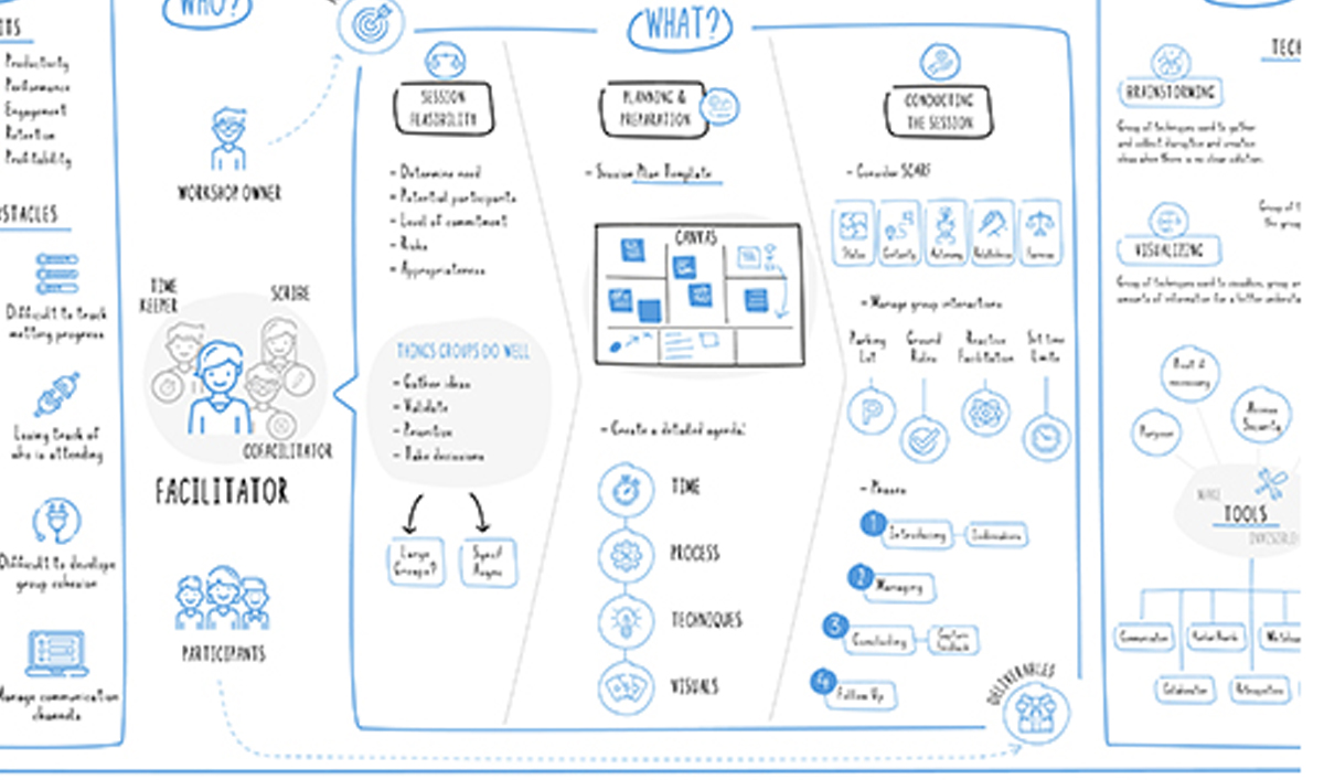 La infografía resume los aprendizajes, contenidos del curso Agile Remote Facilitation y claves para facilitar con éxito un workshop en remoto.